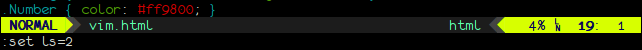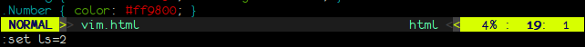 Não que tenha melhorado muito, mas agora você tem informações sobre qual o modo que você está atualmente (que vai mudar de cor conforme você passa para o modo de inserção ou visual), o nome do arquivo, o tipo de arquivo (que define qual a sintaxe está sendo usada), posição do cursor em relação ao todo do arquivo (em percentual) e a posição absoluta do mesmo (em linhas em colunas).